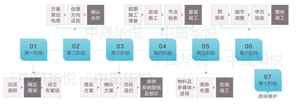 中晟華悅多年服務流程與項目經驗,以實現項目順利高效完成為目的,對甲方提供整個展館建設的前期準備及推進程序,請悉知。